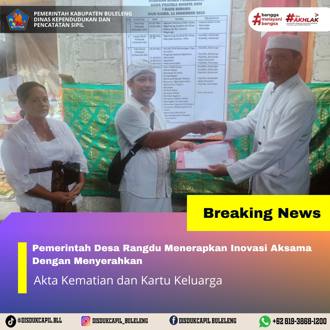Pemerintah Kabupaten Buleleng melalui Dinas Kependudukan dan Pecatatan Sipil (Disdukcapil) Kabupaten Buleleng memaksimalkan serta mempermudah pelayanan kependudukan masyarakat dengan beberapa inovasi, yakni BALITA (Bayi Lahir Berakta), NYAKSI (Menyerahkan Akta Kawin Saat Acara Perkawinan) dan AKSAMA ( Akta Kematian Diserahkan Saat Masih Berduka) melalui aplikasi Aku Online. Di Desa Rangdu Kecamatan Seririt, telah diterapkan program Aksama (Akta Kematian Diserahkan Saat Masih Berduka) yang dilakukan secara langsung oleh Kadus Karya Nadi Desa Rangdu dengan menyerahkan Akta Kematian atas nama I Made Subawa dan Kartu Keluarga atas nama Ni Ketut Kareni kepada pihak keluarga almarhum di Desa Rangdu, Jumat (12/12).