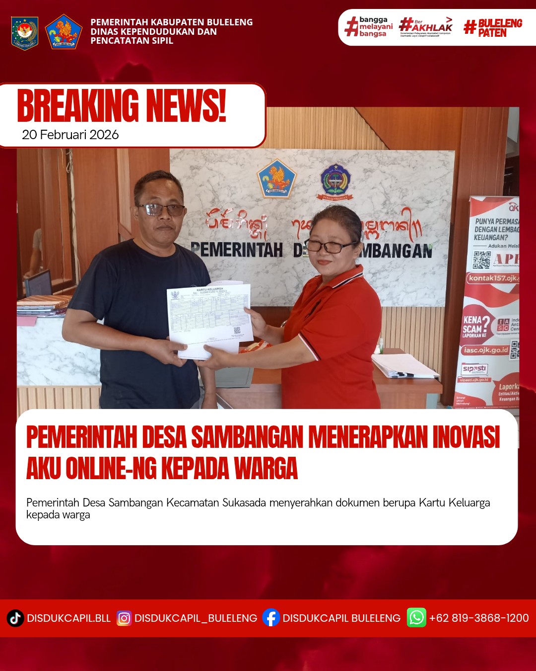 Pemerintah Kabupaten Buleleng melalui Dinas Kependudukan dan Pecatatan Sipil (Disdukcapil) Kabupaten Buleleng memaksimalkan serta mempermudah pelayanan kependudukan masyarakat dengan beberapa inovasi, melalui aplikasi AKU Online-NG. Dimana dalam penerapan aplikasi Aku Online-NG tersebut masyarakat tidak perlu lagi datang ke Dinas Dukcapil untuk melakukan pelayanan langsung cukup dengan datang ke Desa nanti akan dibantu oleh operator Desa masing-masing. Di Desa Sambangan Kecamatan Sukasada, telah diserahkan dokumen kependudukan berupa Kartu Keluarga atas nama Gede Seger diserahkan oleh Kasi Pemerintahan Desa Sambangan bertempat di Kantor Perbekel Desa Sambangan, Kecamatan Sukasada, Kabupaten Buleleng, Jumat (20/2).