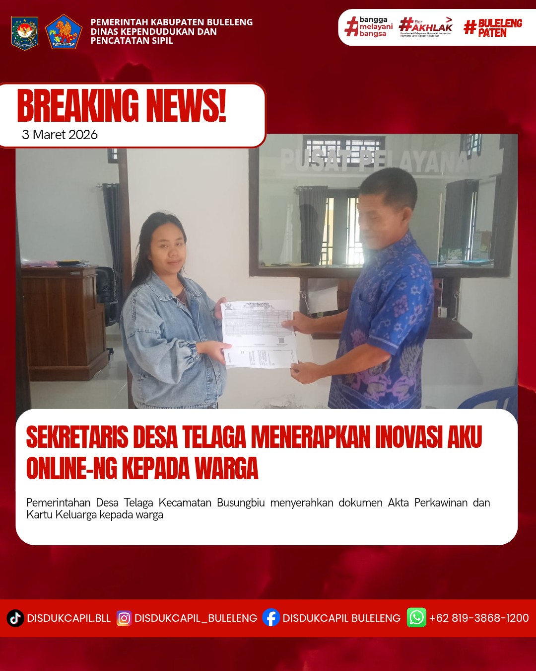 Pemerintah Kabupaten Buleleng melalui Dinas Kependudukan dan Pecatatan Sipil (Disdukcapil) Kabupaten Buleleng memaksimalkan serta mempermudah pelayanan kependudukan masyarakat dengan beberapa inovasi, melalui aplikasi AKU Online-NG. Dimana dalam penerapan aplikasi Aku Online-NG tersebut masyarakat tidak perlu lagi datang ke Dinas Dukcapil untuk melakukan pelayanan langsung cukup dengan datang ke Desa nanti akan dibantu oleh operator Desa masing-masing. Di Desa Telaga Kecamatan Busungbiu, telah diserahkan dokumen kependudukan berupa Kartu Keluarga atas nama I Kadek Sukrisna Suastiana serta Akta Perkawinan atas nama I Kadek Sukrisna Suastiana dengan Ni Gst Ayu Nuansih Dewi yang diserahkan langsung oleh Sekretaris Desa Telaga Bapak I Ketut Sucipta di Desa Telaga, Selasa (3/3).