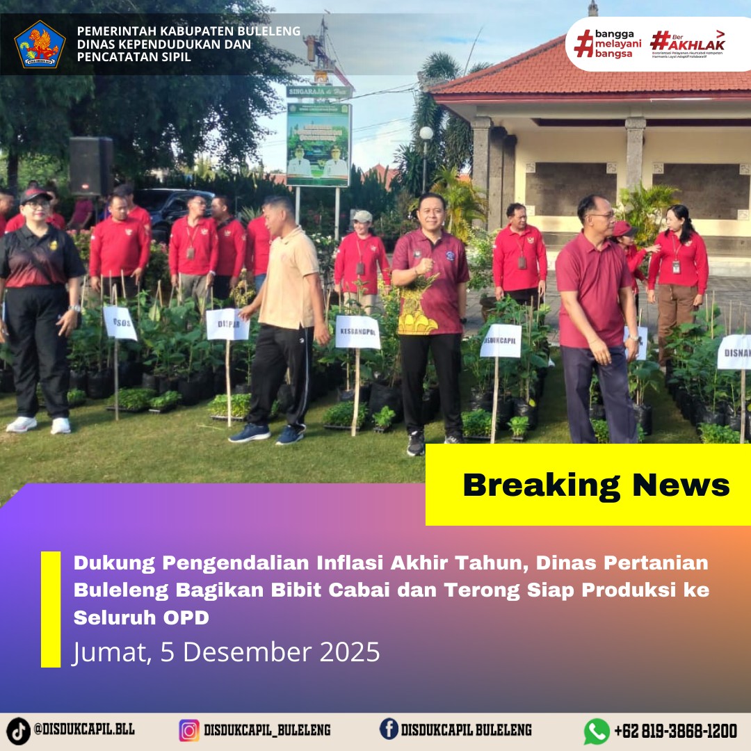 Pemerintah Kabupaten Buleleng melalui Dinas Pertanian bergerak cepat untuk mengantisipasi dan mengendalikan gejolak inflasi yang kerap terjadi menjelang akhir tahun, khususnya pada komoditas pangan seperti cabai dan terong. Upaya ini diwujudkan melalui program pembagian bibit tanaman cabai dan terong yang sudah siap berproduksi kepada seluruh Organisasi Perangkat Daerah (OPD) di lingkungan Pemerintah Daerah Kabupaten Buleleng, Jumat (5/12).