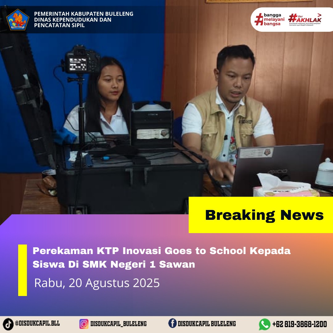 Pada kali ini Rabu, 20 Agustus 2025 pelayanan perekaman KTP-el dilaksanakan di SMK Negeri 1 Sawan. Hasil perekaman di SMK Negeri 1 Sawan dengan data BNBA sebanyak 88 siswa dan total yang melakukan perekaman sebanyak 33 orang, dimana hasil perekaman data di dalam BNBA sebanyak 33 siswa dan tidak ada data di luar BNBA. Sisa data BNBA yang belum perekaman sebanyak 55 siswa, informasi dari sekolah sisa BNBA kebanyakan masih magang di industri sehingga tidak bisa hadir perekaman disekolah, sudah disarankan agar melakukan perekaman secara mandiri ke Kantor Camat.