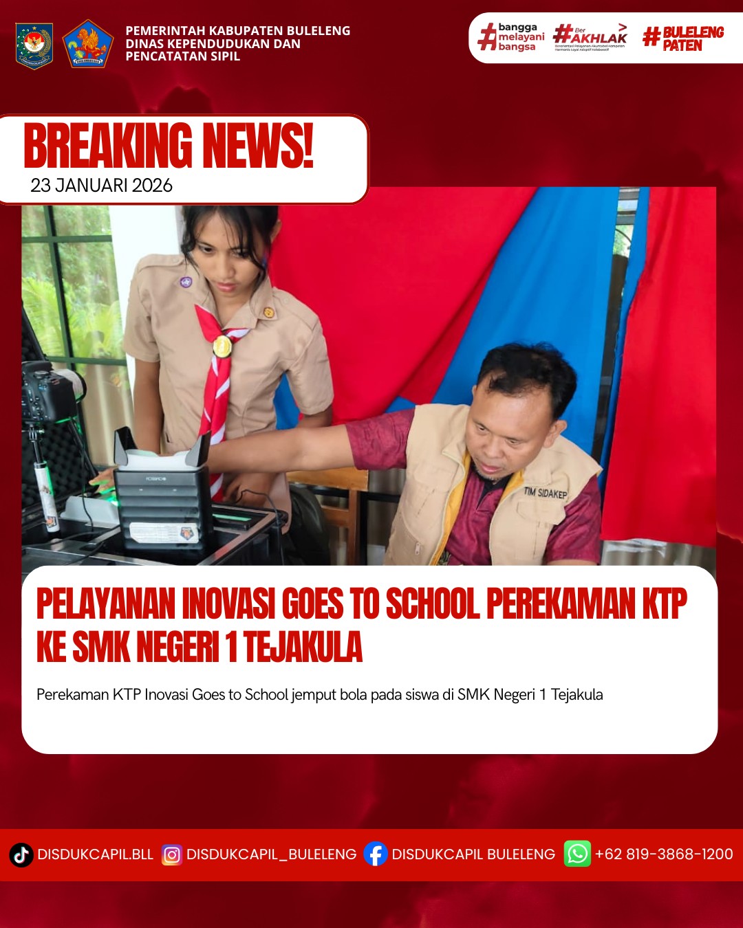 Pada kali ini Jumat, 23 Januari 2026 pelayanan perekaman KTP-el dilaksanakan di SMK Negeri 1 Tejakula. Hasil perekaman di SMK Negeri 1 Tejakula dengan data BNBA sebanyak 180 orang dan total yang melakukan perekaman sebanyak 88 orang, dimana hasil perekaman data di dalam BNBA sebanyak 72 orang dan data di luar BNBA sebanyak 16 orang yang melakukan perekaman. Dilihat dari hasil tersebut sisa data BNBA yang belum perekaman sebanyak 108 orang keterangan dari pihak sekolah siswa yang belum perekaman masih magang di industri.