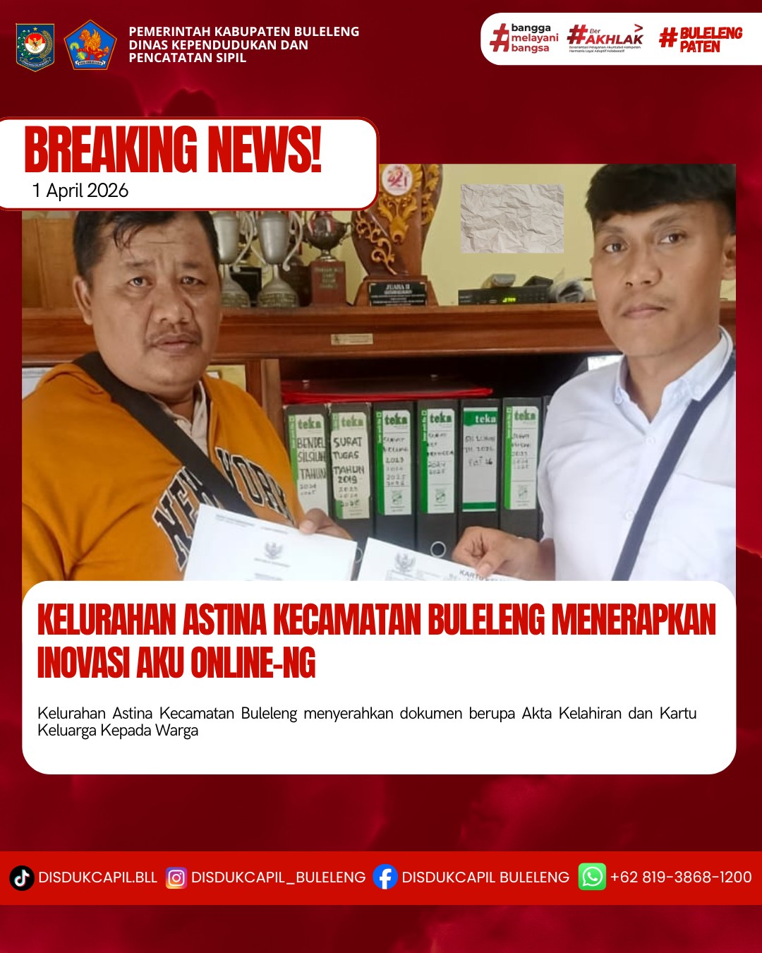 Pemerintah Kabupaten Buleleng melalui Dinas Kependudukan dan Pecatatan Sipil (Disdukcapil) Kabupaten Buleleng memaksimalkan serta mempermudah pelayanan kependudukan masyarakat dengan beberapa inovasi, melalui aplikasi AKU Online-NG. Dimana dalam penerapan aplikasi Aku Online-NG tersebut masyarakat tidak perlu lagi datang ke Dinas Dukcapil untuk melakukan pelayanan langsung cukup dengan datang ke Desa nanti akan dibantu oleh operator Desa masing-masing. Di Kelurahan Liligundi Kecamatan Buleleng, telah diserahkan dokumen kependudukan berupa Akta Kelahiran dan Kartu Keluarga atas nama Kadek Suparta warga Kelurahan Liligundi yang diserahkan langsung oleh Kelurahan Liligundi Kecamatan Buleleng, Kabupaten Buleleng, Rabu (1/4).