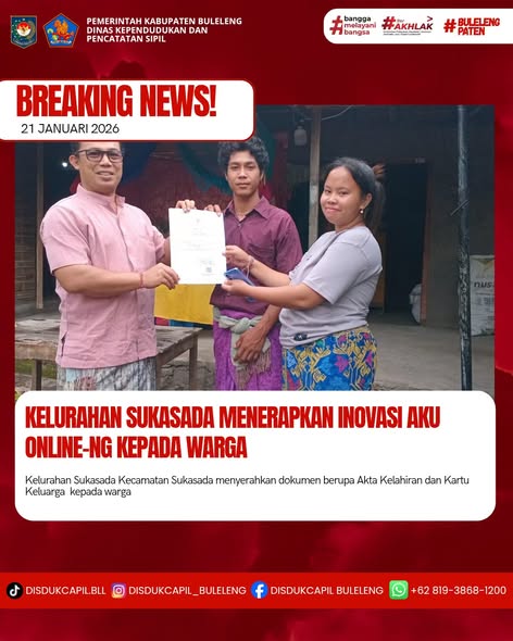 Pemerintah Kabupaten Buleleng melalui Dinas Kependudukan dan Pecatatan Sipil (Disdukcapil) Kabupaten Buleleng memaksimalkan serta mempermudah pelayanan kependudukan masyarakat dengan beberapa inovasi, melalui aplikasi AKU Online-NG. Dimana dalam penerapan aplikasi Aku Online-NG tersebut masyarakat tidak perlu lagi datang ke Dinas Dukcapil untuk melakukan pelayanan langsung cukup dengan datang ke Desa nanti akan dibantu oleh operator Desa masing-masing. Di Kelurahan Sukasada Kecamatan Sukasada, telah diserahkan dokumen kependudukan berupa Akta Kelahiran dan Kartu Keluarga atas nama Ketut Mertayasa warga Lingkungan Sangket, Kelurahan Sukasada yang diserahkan langsung oleh Kepala Lingkungan Sangket Kelurahan Sukasada Kecamatan Sukasada, Kabupaten Buleleng, Kamis (22/1).