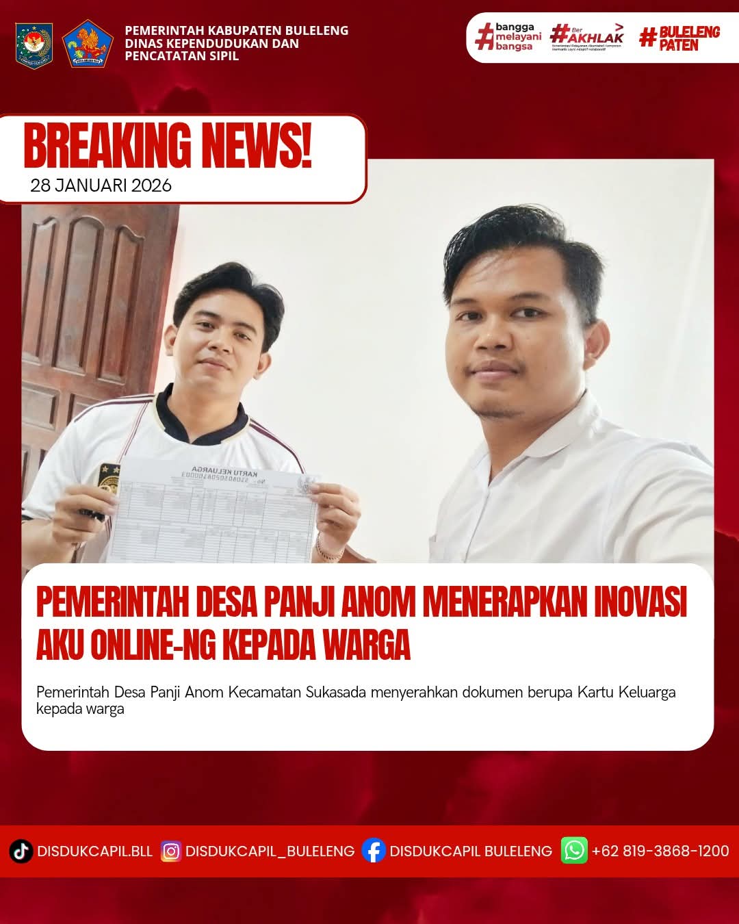 Pemerintah Kabupaten Buleleng melalui Dinas Kependudukan dan Pecatatan Sipil (Disdukcapil) Kabupaten Buleleng memaksimalkan serta mempermudah pelayanan kependudukan masyarakat dengan beberapa inovasi, melalui aplikasi AKU Online-NG. Dimana dalam penerapan aplikasi Aku Online-NG tersebut masyarakat tidak perlu lagi datang ke Dinas Dukcapil untuk melakukan pelayanan langsung cukup dengan datang ke Desa nanti akan dibantu oleh operator Desa masing-masing. Di Desa Panji Anom Kecamatan Sukasada, telah diserahkan dokumen kependudukan berupa Kartu Keluarga atas nama I Ketut Suardana yang diserahkan langsung oleh Kasi Pemerintahan Desa Panji Anom bertempat di Kantor Perbekel Panji Anom, Kecamatan Sukasada, Rabu (28/1).
