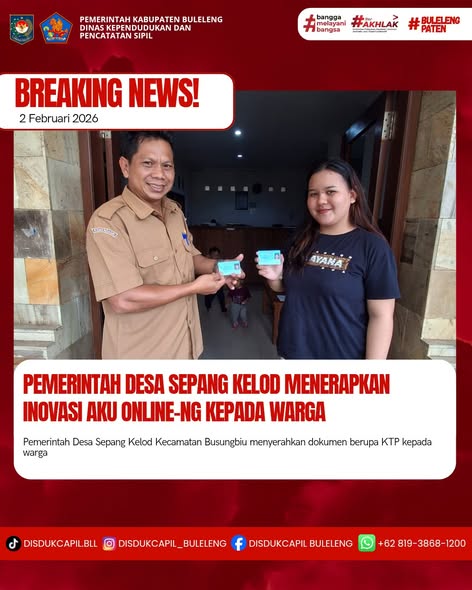 Pemerintah Kabupaten Buleleng melalui Dinas Kependudukan dan Pecatatan Sipil (Disdukcapil) Kabupaten Buleleng memaksimalkan serta mempermudah pelayanan kependudukan masyarakat dengan beberapa inovasi, melalui aplikasi AKU Online. Dimana dalam penerapan aplikasi Aku Online tersebut masyarakat tidak perlu lagi datang ke Dinas Dukcapil untuk melakukan pelayanan langsung cukup dengan datang ke Desa nanti akan dibantu oleh operator Desa masing-masing. Di Desa Sepang Kelod Kecamatan Busungbiu telah diserahkan dokumen kependudukan berupa Kartu Tanda Penduduk (KTP) yang diserahkan oleh Kelian Banjar Dinas Gunung Sari, bertempat di Kantor Perbekel Desa Sepang Kelod, Kecamatan Busungbiu, Senin (2/2).