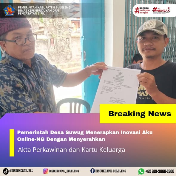 Pemerintah Kabupaten Buleleng melalui Dinas Kependudukan dan Pecatatan Sipil (Disdukcapil) Kabupaten Buleleng memaksimalkan serta mempermudah pelayanan kependudukan masyarakat dengan beberapa inovasi, melalui aplikasi AKU Online-NG. Dimana dalam penerapan aplikasi Aku Online-NG tersebut masyarakat tidak perlu lagi datang ke Dinas Dukcapil untuk melakukan pelayanan langsung cukup dengan datang ke Desa nanti akan dibantu oleh operator Desa masing-masing. Di Desa Suwug Kecamatan Sawan, telah diserahkan dokumen kependudukan berupa Akta Perkawinan dan Kartu Keluarga yang diserahkan secara lansung oleh Pemerintahan Desa Suwug, Kamis (30/10).