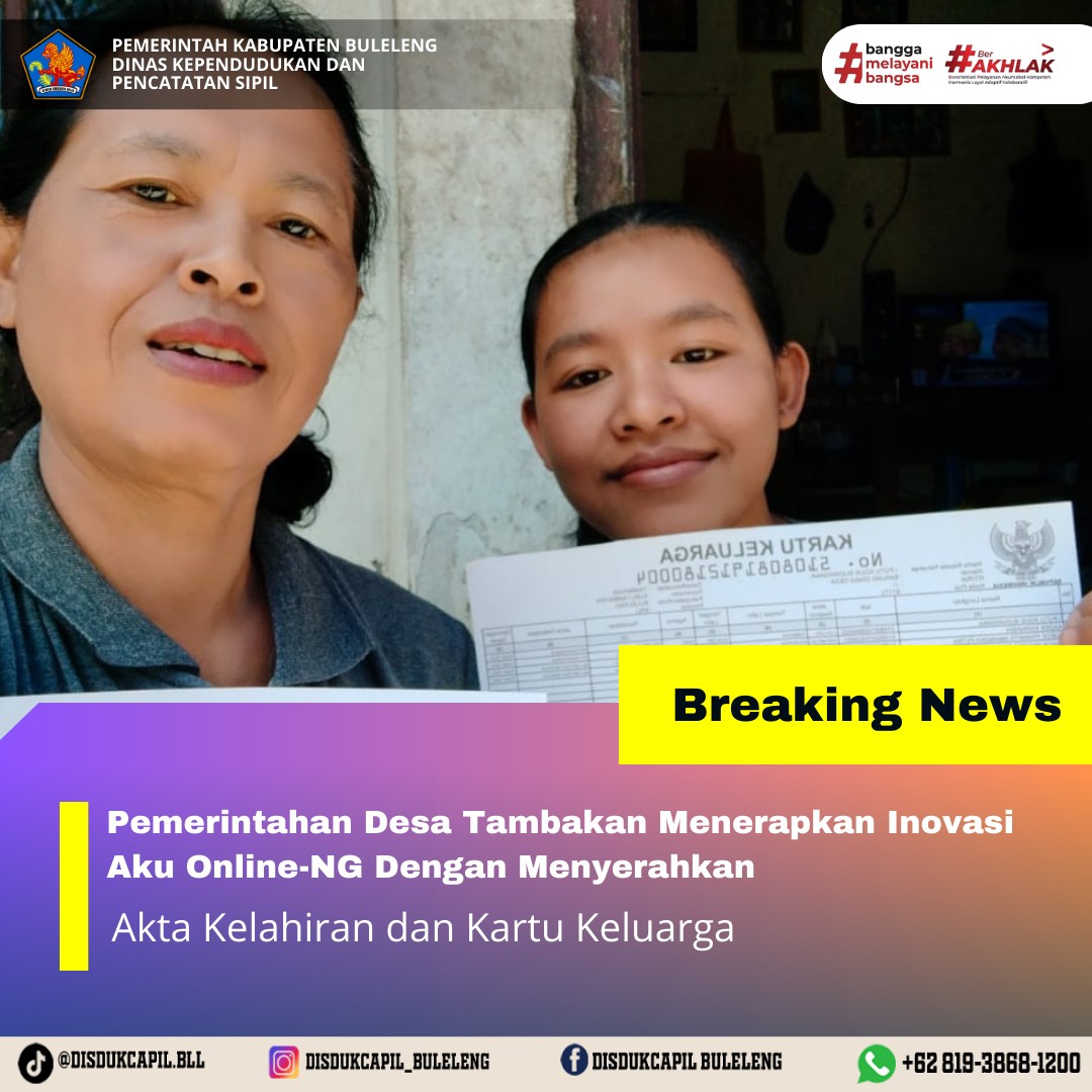 Pemerintah Kabupaten Buleleng melalui Dinas Kependudukan dan Pecatatan Sipil (Disdukcapil) Kabupaten Buleleng memaksimalkan serta mempermudah pelayanan kependudukan masyarakat dengan beberapa inovasi, melalui aplikasi AKU Online-NG. Dimana dalam penerapan aplikasi Aku Online-NG tersebut masyarakat tidak perlu lagi datang ke Dinas Dukcapil untuk melakukan pelayanan langsung cukup dengan datang ke Desa nanti akan dibantu oleh operator Desa masing-masing. Di Desa Tambakan Kecamatan Kubutambahan, telah diserahkan dokumen kependudukan berupa Akta Kelahiran dan Kartu Keluarga atas nama Putu Agus Budiarsana yang diserahkan secara langsung oleh Staf Desa Tambakan Kecamatan Kubutambahan, Jumat (26/9).