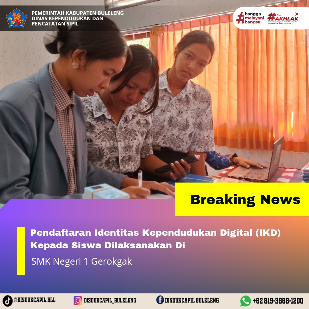Menerapkan aturan pemerintah tersebut, Dinas Kependudukan dan Pencatatan Sipil Kabupaten Buleleng menyelenggarakan Pendaftaran Identitas Kependudukan Digital ke sekolah-sekolah, Dinas, Lembaga dan Perusahaan secara bergilir setiap harinya. Kali ini pelaksanaan pendaftaran Identitas Kependudukan Digital kepada Siswa yang dilaksanakan di SMK Negeri 1 Gerokgak, Rabu (1/10).