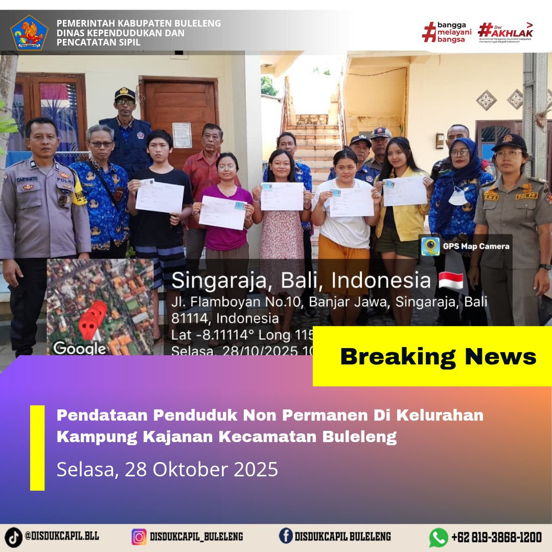 Kali ini Selasa, 28 Oktober 2025, Dinas Kependudukan dan Pencatatan Sipil Kabupaten Buleleng melaksanakan kegiatan pendataan penduduk Non Permanen di Kelurahan Kampung Kajanan Kecamatan Buleleng. Dari pendataan penduduk kali ini didapatkan hasil :