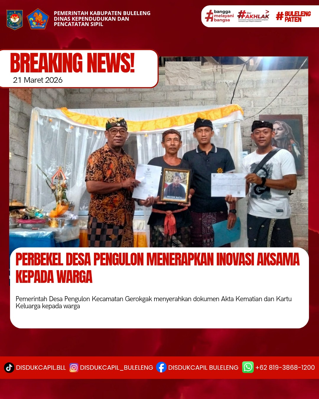 Pemerintah Kabupaten Buleleng melalui Dinas Kependudukan dan Pecatatan Sipil (Disdukcapil) Kabupaten Buleleng memaksimalkan serta mempermudah pelayanan kependudukan masyarakat dengan beberapa inovasi, yakni BALITA (Bayi Lahir Berakta), NYAKSI (Menyerahkan Akta Kawin Saat Acara Perkawinan) dan AKSAMA (Akta Kematian Diserahkan Saat Masih Berduka) melalui aplikasi Aku Online-NG. Di Desa Pengulon Kecamatan Gerokgak, telah diterapkan program Aksama (Akta Kematian Diserahkan Saat Masih Berduka) yang dilakukan secara langsung oleh Perbekel Desa Pengulon Drs. I Nyoman Juliana dengan menyerahkan Akta Kematian atas nama Wayan Nata dan Kartu Keluarga atas nama Wayan Nardi kepada pihak keluarga di rumah duka di Desa Pengulon, Sabtu (21/3).